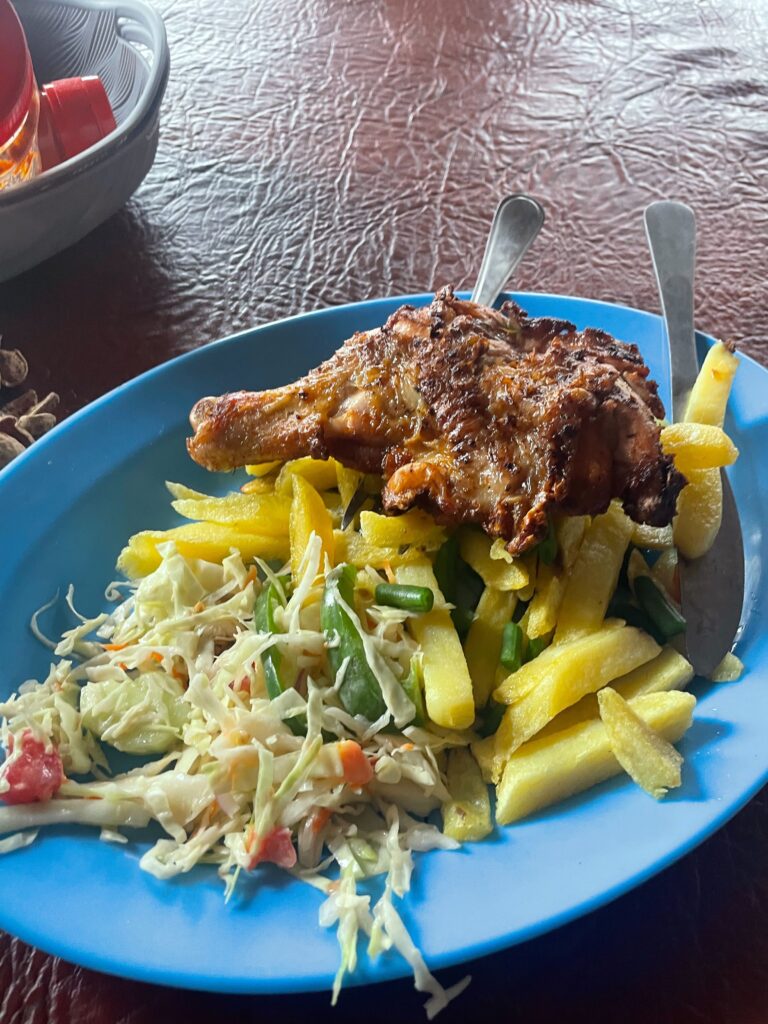 (地元のレストラン。これで300円くらい。チキンにホットソースをつけて食べるのが定番)