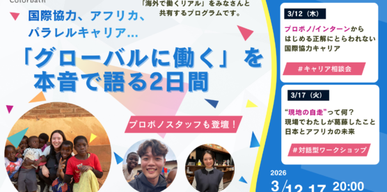3月12日と17日、国際協力をテーマとした「対話型プログラム」を開催します!テーマは、「国際協力キャリア」と「援助/国際開発のリアル」。今年度から本格的に活動をスタートさせた3人の20代スタッフが、みなさんと一緒に考えて … 続きを読む 【海外で働きたい/働いている人へ】「グローバルに働く」を本音で語る2日間